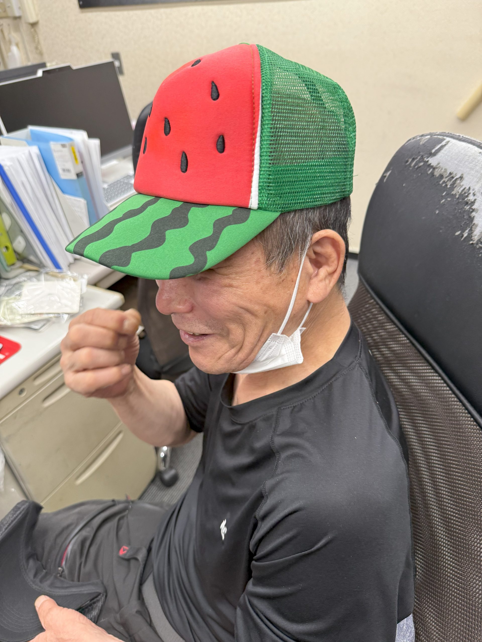 沖縄のお土産にスイカのキャップをプレゼントしました