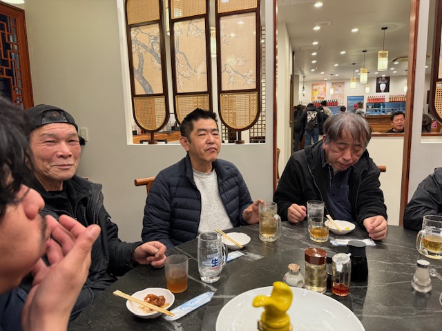 2025忘年会!!2025/12/30 30日まで頑張った心電通工事部隊!! 今年の最後に忘年会を行いました!!! 笑顔な全員! と・・・うかない塩田・・・ 笑顔な男達 と・・・・・うかない塩田・・・・・ 北京ダックをテーブルに敷き 食す龍之介! 左目が難病にかかった塩田さん阿修羅男爵の症状を見てください。 がんばれ塩さん!! きっと治るよ!! 皆さん今年はお疲れさまでした。 来年もよろしくお願い申し上げます。